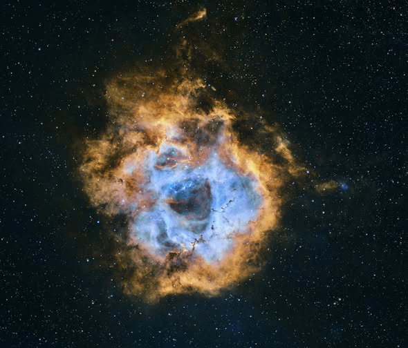The Rosette Nebula – 3 hours (60×180 second integration) in Ha/OIII. William Optics 71 star refractor. ZWO 071MC Pro Camera. Processed using Siril. David Bryant.